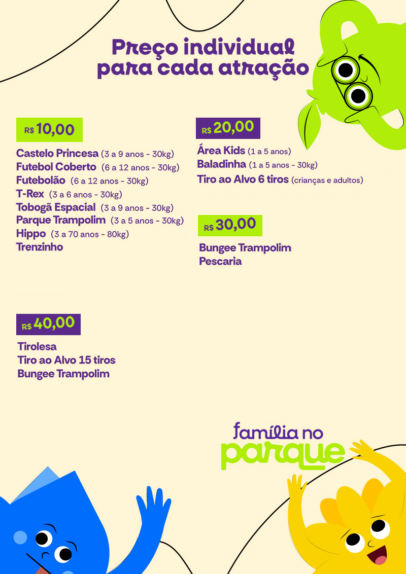 O VIP PASS da direito a você aproveitar todas as atrações do Família do Parque com exceção a atrações com prenda, tiro ao alvo e pescaria, ideal para crianças de 5 a 14 anos.